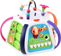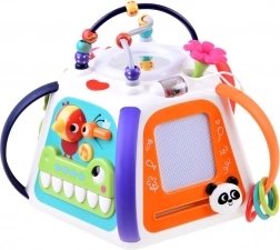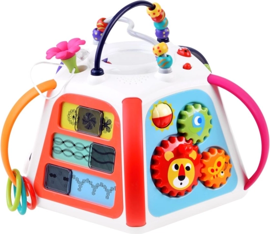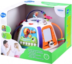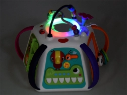 Nakon uključivanja kocka pokreće melodije, zvučne efekte i svjetlosne elemente koji djecu motiviraju na daljnje istraživanje. Ne nedostaje pianino u obliku krokodilskih zubi, pokretni elementi, klizni paneli s optičkim efektom “živih” animacija niti sigurno zrcalce.