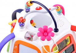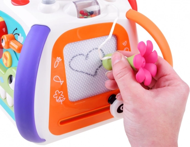 Edukativna multikocka HOLA donosi bogat spektar aktivnosti u jednoj kompaktnoj igrački. Svaka strana nudi drugu vještinu: od crtanja na znikopisu, preko okretanja zupčanika, do otkrivanja životinja ispod listića sa zvučnim povratnim informacijama. Gornji dio krasi labirint s perlicama koji potiče koordinaciju ruka-oko.