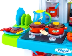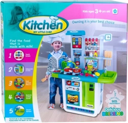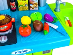Dio kompleta je i bogat set dodataka: povrće na čičak za rezanje, lonac, tava, posuđe, pribor za jelo, čajnik i imitacije namirnica. Kuhinjica razvija finu motoriku, kreativnost i uči djecu osnovama kućanskih obaveza.