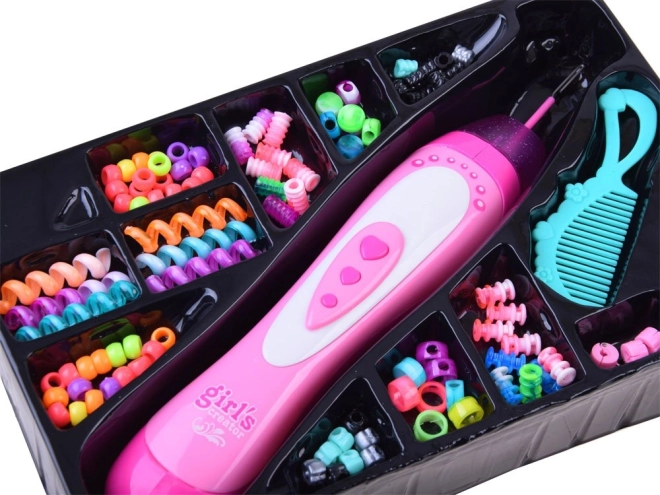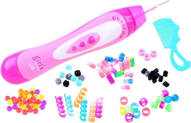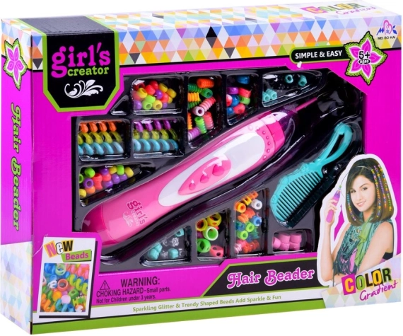 Otkrijte jednostavno i zabavno ukrašavanje kose s ovim setom Girl's Creator. Ergonomski navlakač pomaže vam brzo pričvrstiti perlice na odabrane pramenove, tako da djeca mogu sama sigurno stvarati šarene lookove za svaki dan. Dovoljno je pripremiti pramen, nasuti perlice u spremnik i nježnim pritiskom navlačiti jednu po jednu.