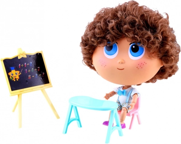 Slatka lutka učitelj Tymek za igru škole donosi djeci mnogo mašte i zabave. U pakiranju se nalaze ploča, stol i stolica. Lutka ima pokretne zglobove i glavu koja se okreće 360°, velike plave oči, pjegice i kovrčavu kosu. Odlično za igranje uloga i razvoj kreativnosti.