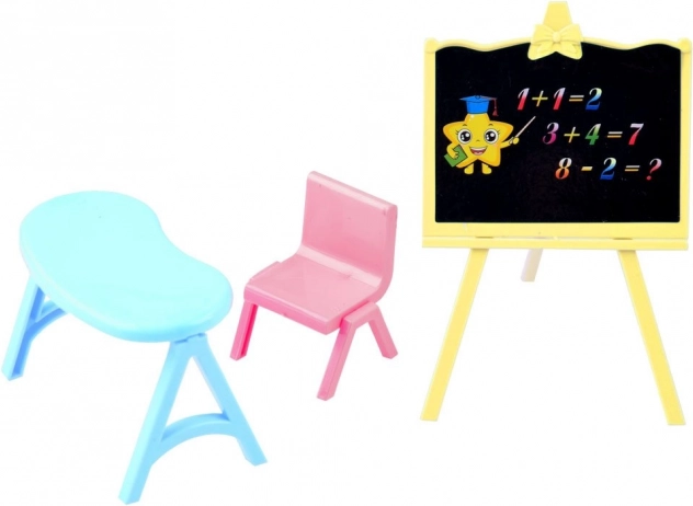 Kompletna oprema za igru škole. Djeca mogu pisati na ploči, posjesti lutku za klupu i stvarati vlastitu nastavu.