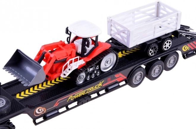 Tegljač s platformnom poluprikolicom sigurno prevozi traktor s prikolicom. Kombinacija za dugačke sate kreativne igre.