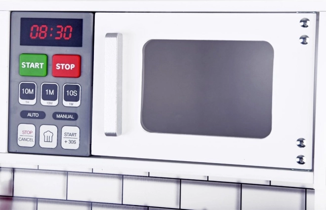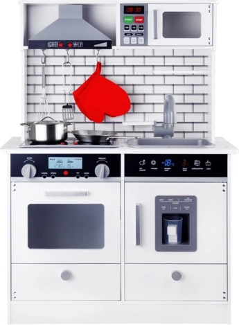 Ova prekrasna drvena kuhinja opremljena je svim potrebnim aparatima koji omogućuju djeci kuhanje najukusnijih jela. Stilizacija u bijelom izvedbi s modernim pločicama savršeno će se uklopiti u bilo kojeg dječjeg sobička ili kuhinjskog kuta.