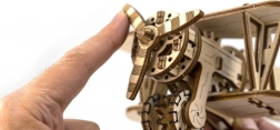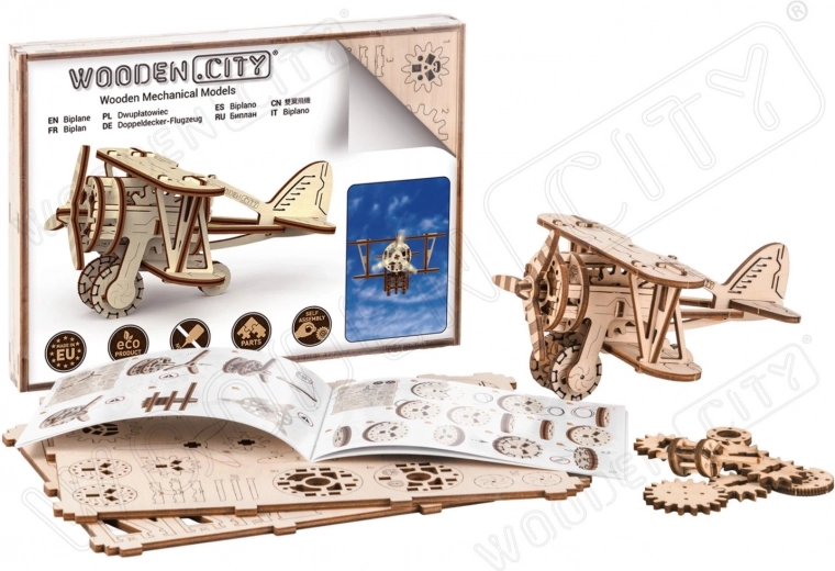 Komplet je izrađen od kvalitetne brezove šperploče i sastavlja se bez potrebe za ljepilom ili alatima. Dimenzije sastavljenog modela su približno 16,1 x 14 x 8,8 cm. Bit će izvrsni poklon za ljubitelje aviona i osigurat će sate zabave i učenja o mehaničkim prijenosima i zupčanicima.