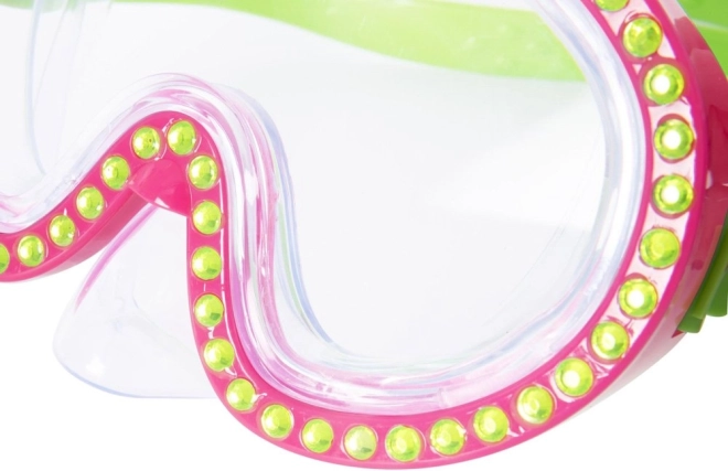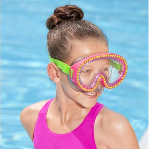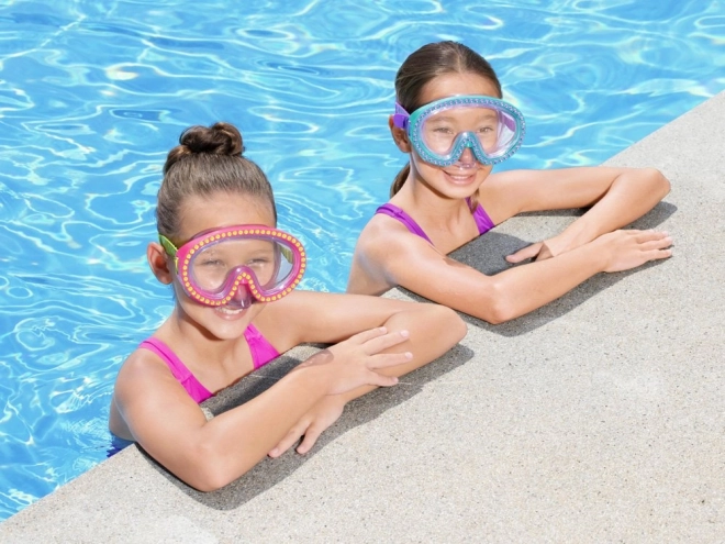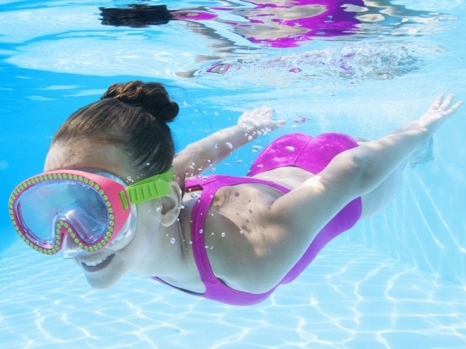 Plivačka maska ukrašena je kristalima koji masci daju jedinstven i elegantan izgled, dok djeca uživaju u plivanju.