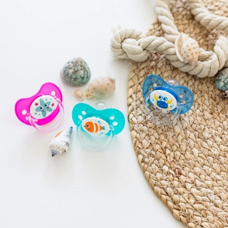 Duda LOVE&SEA izrađena je od visokokvalitetnog silikona bez okusa i mirisa. Ima svjetleću pločicu. Opremljena je ortodontski oblikovanim usisnim dijelom. Zahvaljujući rupicama na štitniku, duda ne iritira osjetljiva dječja usta. Prigušeno svjetlo u tamnom disku olakšava pronalaženje noću. Bez BPA. Dostupna u nekoliko boja i 3 veličine: 22/506 0–6 mjeseci, 22/507 6–18 mjeseci, 22/508 od 18 mjeseci. Poseban, prozračan štitnik sprječava iritaciju kože oko osjetljivih dječjih usta. Sisaljka je izrađena od prozirnog silikona bez okusa i mirisa. Udobna ručka – olakšava pružanje dude i omogućuje jednostavno pričvršćivanje na vrpcu ili lančić za dudu. Šarolik i originalan dizajn. Namijenjena djeci u dobi 0–6 mjeseci. Izrađena od sigurnog materijala bez bisfenola A. Upute za uporabu: Prije prve uporabe dudu iz higijenskih razloga sterilizirajte u kipućoj vodi oko 5 minuta. Nakon hlađenja istisnite preostalu vodu iz dude. Prije svake uporabe dudu temeljito operite u toploj vodi. Ne koristite antibakterijska niti kemijska sredstva za čišćenje. Pretjerana uporaba sredstava za čišćenje može oštetiti plastične dijelove. Nikada nemojte umakati dudu u slatke tvari ili lijekove – time izlažete dijete riziku od oštećenja zubne cakline. Dudu koristite najviše 1–2 mjeseca, zatim je iz higijenskih i sigurnosnih razloga zamijenite novom. Ako djetetu duda uđe u usta, NE PANIČARITE – duda je konstruirana tako da je dijete ne može progutati i u takvim je slučajevima možete sigurno izvaditi iz usta. Dudu vadite što je moguće pažljivije. Dudu čuvajte u čistoj, suhoj i zatvorenoj kutijici. Preporučujemo da se dude ne koriste kod djece starije od 3 godine. Važno! Za sigurnost i zdravlje vašeg djeteta! Prije svake uporabe provjerite ispravnost dude. Provjerite kvalitetu sisaljke temeljitim istezanjem u svim smjerovima. Pri prvim znakovima oštećenja dudu odmah bacite i nemojte je dalje koristiti. Koristite samo one kopče i lančiće za dudu koji udovoljavaju zahtjevima norme EN12586. Nikada ne pričvršćujte dudu na različite vrpce, vezice ili trakice odjeće. Dijete se može ugušiti. Ne ostavljajte dudu na izravnom sunčevom svjetlu, u blizini izvora topline ili u dezinficijensima dulje nego što je preporučeno – to može uzrokovati slabljenje sisaljke. Skinuti poklopac držite izvan dosega djeteta – kako biste spriječili moguće gušenje. Silikonska duda udovoljava zahtjevima: Direktiva Europskog parlamenta i Vijeća 2001/95/EC o općoj sigurnosti proizvoda; EN 1400 – 1 Proizvodi za njegu djece – Dude za dojenčad i malu djecu – Dio 1: Opći sigurnosni zahtjevi i informacije o proizvodu; EN 1400 – 2 Proizvodi za njegu djece – Dude za dojenčad i malu djecu – Dio 2: Mehanički zahtjevi i ispitivanja; EN 1400 – 3 Proizvodi za njegu djece – Dude za dojenčad i malu djecu – Dio 3: Kemijski zahtjevi i ispitivanja