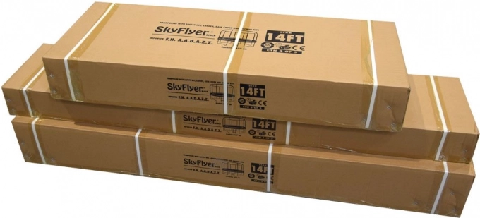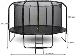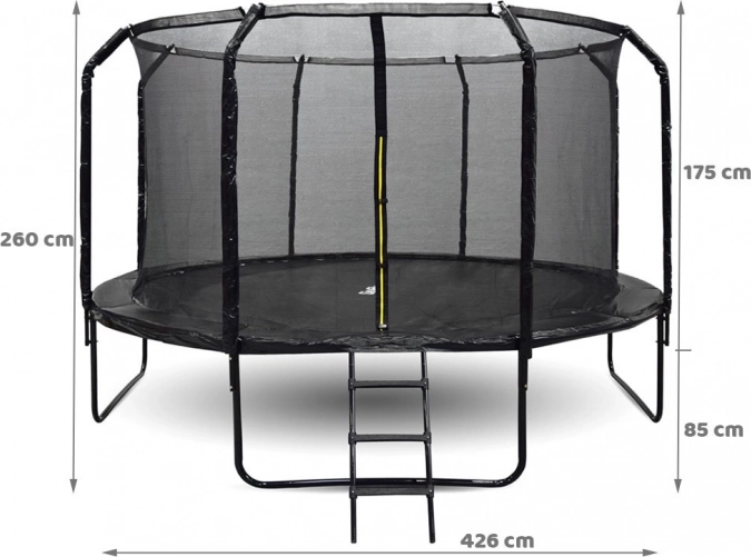 Robustan trampolin SkyFlyer promjera 426 cm (14 ft) nudi velikodušan prostor za skakanje, kondicijske vježbe i slobodno vrijeme. Za sigurnost se brine visoka zaštitna mreža zategnuta pomoću gornjeg obruča i meko podstavljeni profilirani stupovi. Ulaz je osiguran patentnim zatvaračem i kopčom za maksimalnu sigurnost djece.