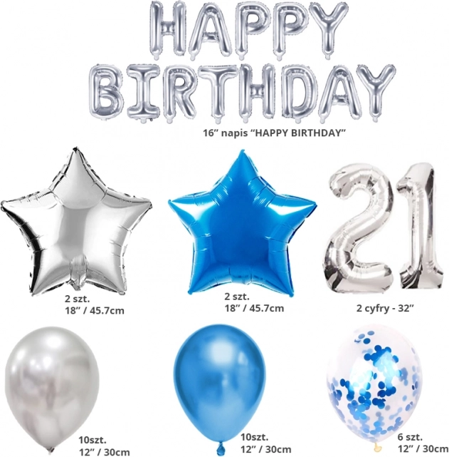 Set rođendanskih balona omogućuje vam stvaranje jedinstvene atmosfere na proslavi 21. rođendana. Nezaboravni doživljaj za glavnog slavljenika i sve sudionike zahvaljujući originalnoj dekoraciji.