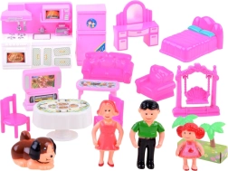 Opremajte spavaću sobu, dnevni boravak i kuhinju – u pakiranju se nalaze krevet, sofa, naslonjač, stol i stolice, TV s ormarićem, kuhinjski blok i hladnjak, a uz to figurice obitelji i psića.