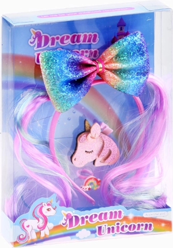 Stilizan i šarolik set dodataka za kosu stvara bajkovit izgled u trenu. Traka za kosu s mekim satenskim premazom udobna je za nošenje, a krasi je upečatljiva sjajna mašna u duginim bojama s motivom ponija. Set upotpunjuju sjajna šnala s jednorogom i slatki plastični prstenčić s dugom, koji outfitu daju razigrani štih.