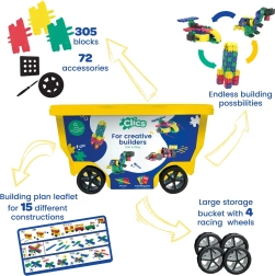 Uz priložene planove složit ćete 15 različitih modela, ali dječja mašta nema granica – varijacija je bezbroj. Konstruktor razvija finu motoriku, logičko razmišljanje, strpljenje i prostornu predodžbu. Veličina dijelova idealna je za male ruke, a sigurni materijali jamče bezbrižnu igru.