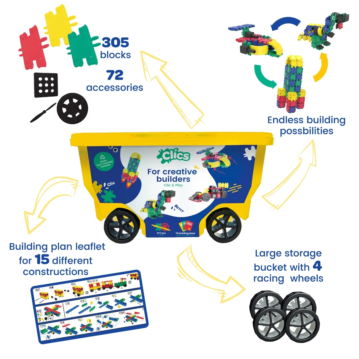 Otkrijte kreativni svijet CLICS konstruktora u praktičnoj pokretnoj kutiji. Set sadrži 377 dijelova u živim bojama i omogućuje izradu automobila, životinja, robota, kućica i drugih originalnih kreacija. Spajanje “na klik” je brzo i jednostavno, a gotovi modeli su stabilni.