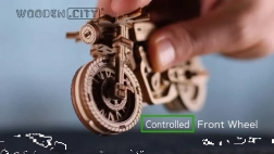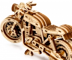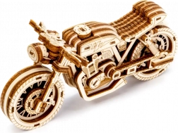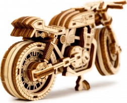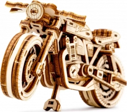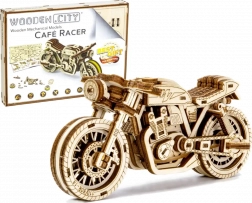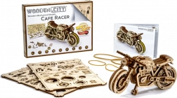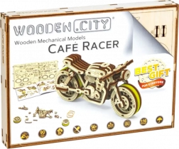 Motocikl Café Racer tvrtke WOODEN CITY detaljno je razrađen drveni model u mjerilu 1:16 koji će oživjeti vaš stol ili vitrinu. Zahvaljujući motoru na gumicu i mehanizmu povratnog hoda model se kreće naprijed i natrag, postiže doseg od približno 1 metra i nudi pogled na pravu mehaniku zupčanika.