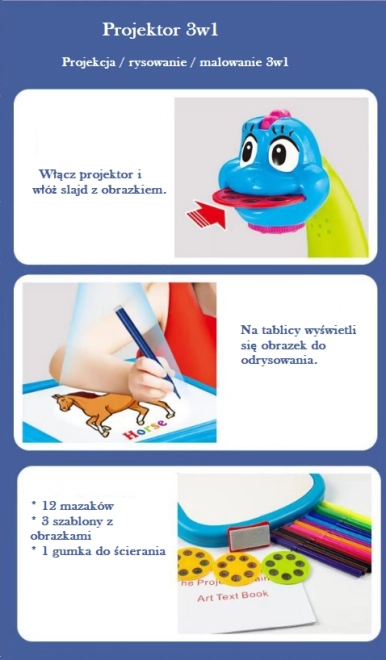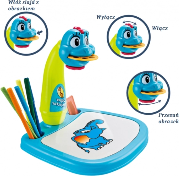 Multifunkcionalni projektor za učenje crtanja u obliku plavog dinosaura projicira slike izravno na podlogu, pa dijete lako može precrtati obris i zatim obojiti crtež. Kroz zabavnu igru vježba maštu, koordinaciju oko–ruka i sigurnost u crtanju. Priloženi dijapozitivi s predlošcima i kolor flomasteri osiguravaju mnoštvo ideja i radosti stvaranja.