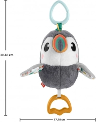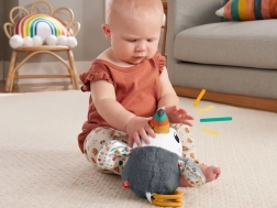 Ovaj mekani tukan razveselit će bebu na putu i kod kuće. Različite teksture i kontrastne boje stimuliraju vid i dodir, dok zvečka i nježno cinglanje pružaju zvučne poticaje. Nakon povlačenja donjih prstenova tukan radosno maše krilima, što djecu uči principu uzrok–posljedica i potiče daljnje otkrivanje.
