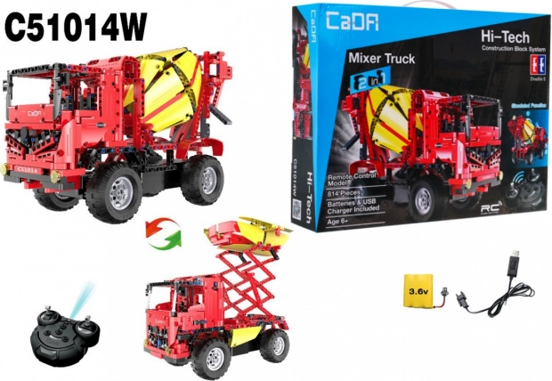 Sastavite i upravljajte vlastitim građevinskim vozilom uz CaDA 2u1 set s 814 dijelova. Daljinsko upravljanje na 2,4 GHz, rotirajuća miješalica, podizna kabina i meke gumene gume nude realističnu vožnju i kreativnu gradnju. Iz jednog seta možete složiti miješalicu betona ili teretno vozilo sa škare dizalicom.