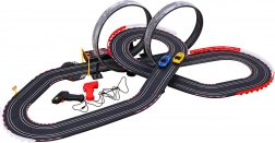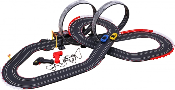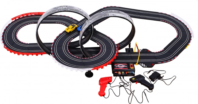 Ovaj set uključuje dva ručna upravljača za lako upravljanje autićima po stazi i nudi dinamično trkaće iskustvo.