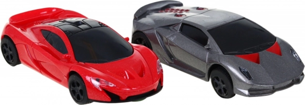 Set sadrži dva trkaća autića, crveni i sivi, dizajnirani kao sportski automobili s istaknutim spojlerima i crnim kotačima.