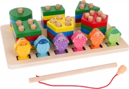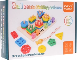 Set 2 u 1, drvene puzzle i pecanje ribica namijenjen je djeci od 3 godine. Set se sastoji od drvene podloge s klinovima i pravokutnim udubljenjima. Na klinove se stavljaju raznobojni blokovi zaobljenih krajeva i razliÄitih oblika, a u udubljenja se umeÄu ribice. RasporeÄeni su razliÄiti obojeni geometrijski oblici, primjerice krug, pravokutnik, trokut, kvadrat, peterokut i Å”esterokut. Krug ima jednu rupu, pravokutnik dvije, trokut tri, kvadrat Äetiri, peterokut pet, a Å”esterokut Å”est. Zadatak djeteta je spretno pridružiti odreÄeni oblik odgovarajuÄem broju klinova. Osim toga, na ploÄi je igra pecanja ribica. Igra se sastoji od postavljanja ribica s magnetima u pravokutne otvore pomoÄu magnetnog Å”tapa za pecanje. Set je idealan za razvoj manualne spretnosti, vježba motoriÄku, taktilnu i vidnu koordinaciju djeteta. Dijete razvija maÅ”tu i potiÄe kreativnost. |