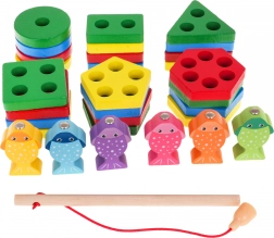 - drveni stalak s klinovima i udubljenjima, - 4 kruga, .- 4 pravokutnika, .- 4 trokuta, .- 4 kvadrata, .- 4 peterokuta, .- 4 Ŕesterokuta, .- 6 ribica, .- magnetni Ŕtap za pecanje. . |