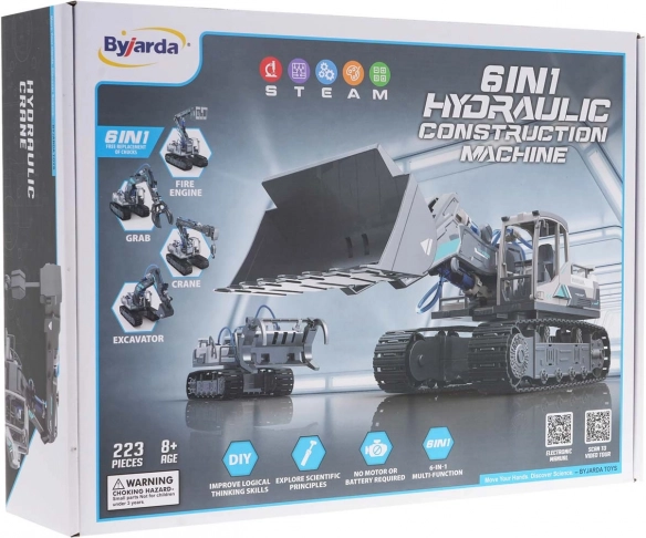 Ovaj edukativni set djeci na zabavan način približava principe hidraulike i mehanike. Od 223 komponente možete sastaviti 6 funkcionalnih modela: bager, utovarivač, vatrogasno vozilo s platformom, dizalicu, grabilicu i buldožer. Svi modeli dijele 360° rotirajuću nadogradnju i gusjenično podvozje s gumenim gusjenicama za glatko kretanje.