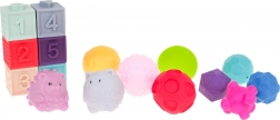 Otkrijte svestrani senzorički set za bebe od 6 mjeseci, koji potiče dodir, vid i motoriku. Sadrži 16 dijelova – mekane loptice, numerirane kocke i simpatične životinjice. Igračke imaju raznolike površine i boje, neke pri stisku pište, što potiče osjetilnu percepciju, hvat i finu motoriku te učenje boja, oblika i brojeva. Pogodno i za kupanje te izrađeno od sigurnih materijala.