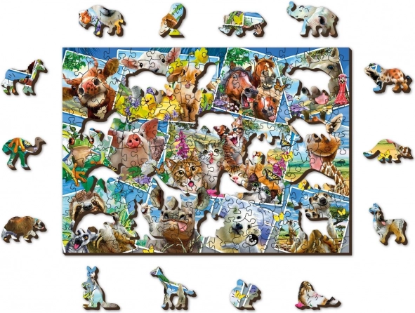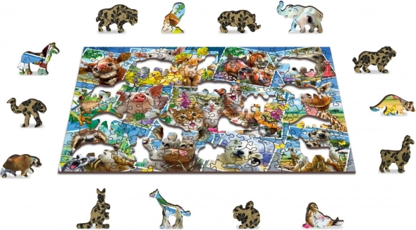 Drvene puzzle WOODEN CITY s motivom „Životinjske razglednice” donose jedinstveno iskustvo slaganja. Zahvaljujući obostranom izvedenom dizajnu možete birati između slaganja prema slici na licu ili prema oblicima na naličju s ponavljajućim uzorkom. Laserom naglašeni detalji daju svakom dijelu dojmljiv izgled, a neki od njih – u obliku životinja, građevina ili predmeta – mogu samostalno stajati kao male figurice.