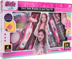 - stroj za pletenje, - uređaj za nanošenje nakita na kosu, - 2 x ukosnica, - 24 x ukras za kosu (“dijamanti”), - 24 x kvačice za ukrase za kosu, - četka za kosu, - 64 gumice za kosu u kutijici s pregradama, - upute. |