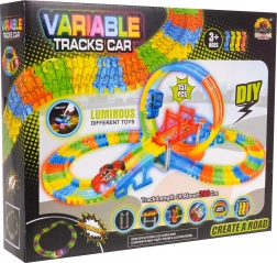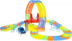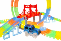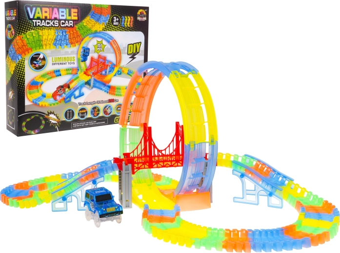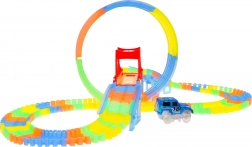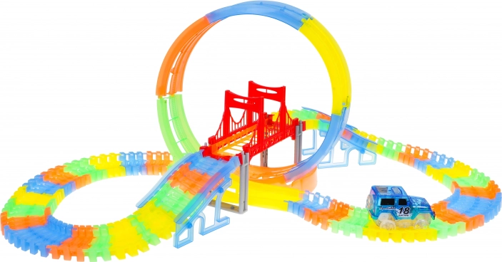 Svjetleća staza u mraku s petljom i autićem u pakiranju prikladna je za djecu od 3 godine. Staze su fleksibilne, mogu se slagati u bilo kojoj kombinaciji, okretati, podizati, preslagivati, i to dok autić vozi. Staze su također fluorescentne i svijetle u mraku. Vozilo koje je dio seta ima LED pozadinsko osvjetljenje, a vožnja u mraku stvara sjajan efekt. Vozilo se napaja s 2 AA baterije 1,5 V (nisu uključene). Za pokretanje auta dovoljno je pritisnuti gumb na krovu. I utrka može početi. |