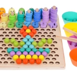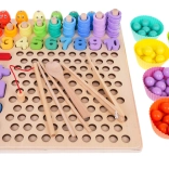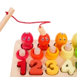 Ovaj šareni drveni edukativni set nudi djeci desetke mogućnosti za igru: lovljenje ribica pomoću magnetskog štapa, nizanje i brojanje prstenova na stupićima, pridruživanje brojeva 1–10, slaganje jednostavnih jednadžbi te prepoznavanje oblika i boja. Silikonske čašice i drvene perle s pincetom, žličicom i štapićima izvrsno razvijaju hvat i preciznost.