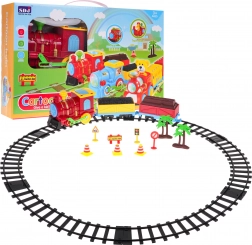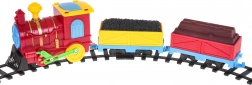 Set sadrži lokomotivu, 2 vagona i tračnice u krugu promjera oko 72,5 cm, plus znakove, čunjeve i stabalca.
