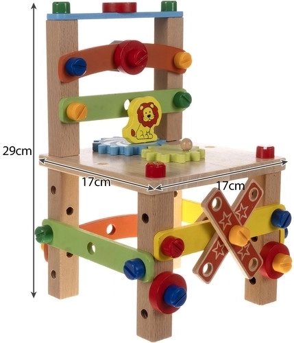 Specifikacije: Dječja stolica dimenzija 29 x 17 x 17 cm nije samo igračka, već i funkcionalni komad namještaja za vaš dom. Cijeli set sadrži sve potrebno za montažu.