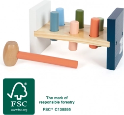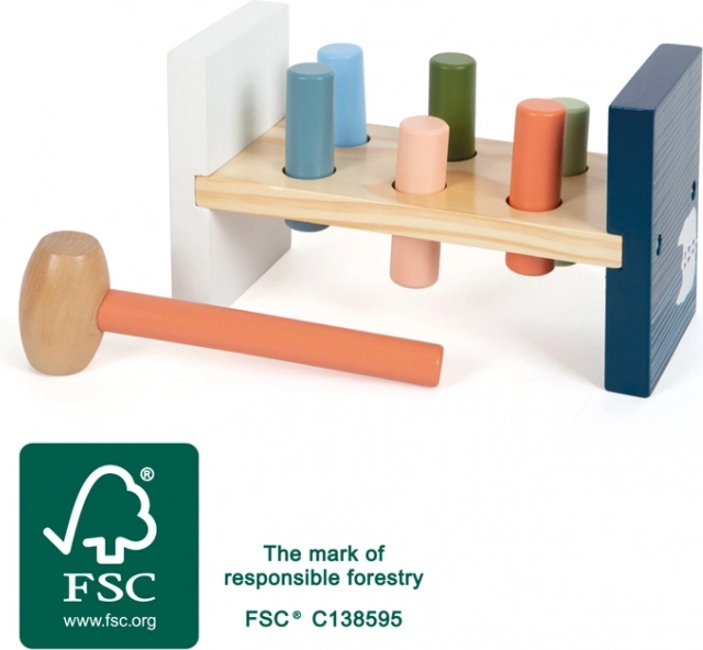 Ova kvalitetna zabijalica od FSC® 100% drva idealna je za prve vještine malih graditelja. Djeca drvenim čekićem zabijaju šarene valjčiće u klupu, a po završetku igru lako nastave jednostavnim okretanjem. Bočni tisak s polarnim medvjedom vizualno je smislen i pri igri naopačke.
