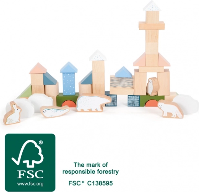 Ovaj moderan set drvenih kocaka s arktičkim motivom nudi bezbroj mogućnosti za slobodnu igru. Djeca mogu graditi kućice, tornjeve i ledene krajolike te smišljati priče s polarnim životinjama. Prirodni izgled upotpunjuju nježne pastelne boje i ilustracije koje privlače pažnju i razvijaju estetsko opažanje.