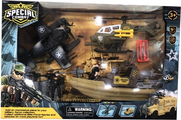 Ovaj veliki vojni set donosi uzbuđenje na kopnu, moru i u zraku! Sa brodom, helikopterom i dvokrilcem, djeca mogu stvarati uzbudljive vojne scenarije.
