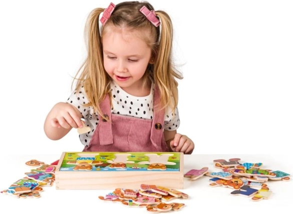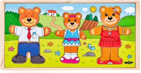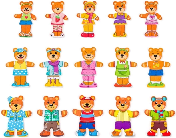 Razvijte kod djece koordinaciju ruke i oka te prepoznavanje boja uz ovu simpatičnu slagalicu. Djeca mogu medvjedićima slagati lica, majice i hlače te stvarati bezbroj zabavnih kombinacija.