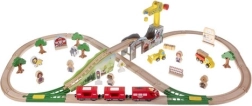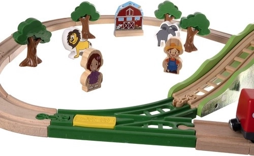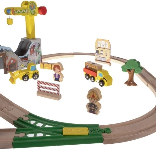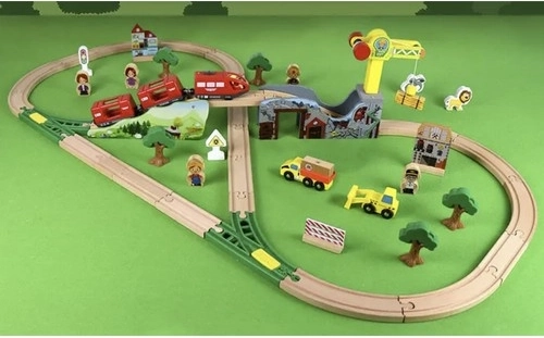 Ova bogato opremljena drvena željeznička pruga donosi djeci sate kreativne igre. Dijelovi su glatko obrađeni i bojani sigurnim bojama. Vlakovne kompozicije se povezuju snažnim magnetima, pa ostaju povezane i pri podizanju. Set dopunjuju dizalica, mostovi, prometni znakovi, stabla, zgrade i radna vozila – sve spremno za raznolike scene.