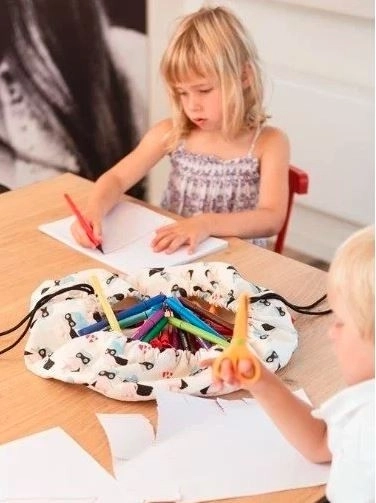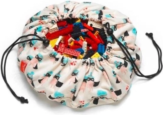 Iz igraće podloge u spremnu vrećicu u trenu – povucite za uzice i gotovo. Idealno za kocke, autiće i plišance.