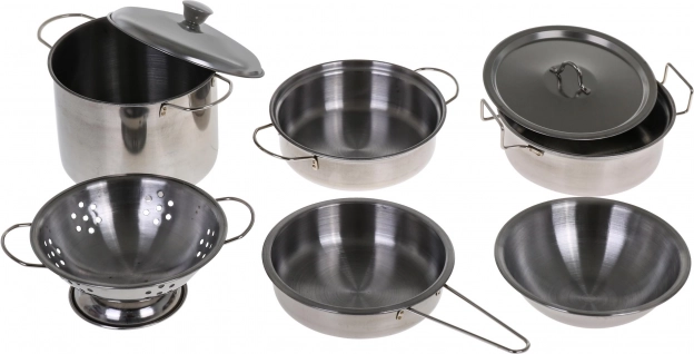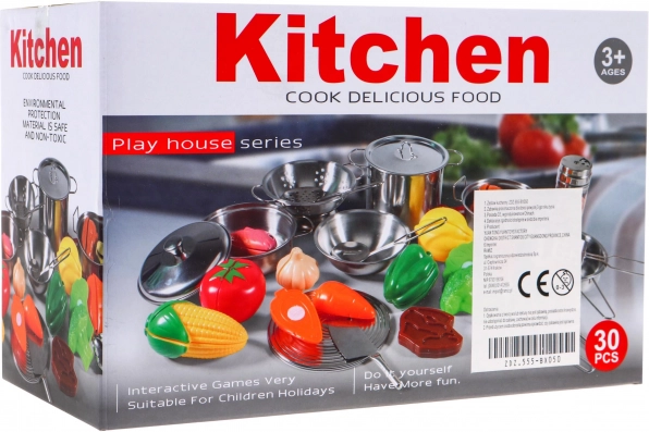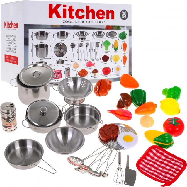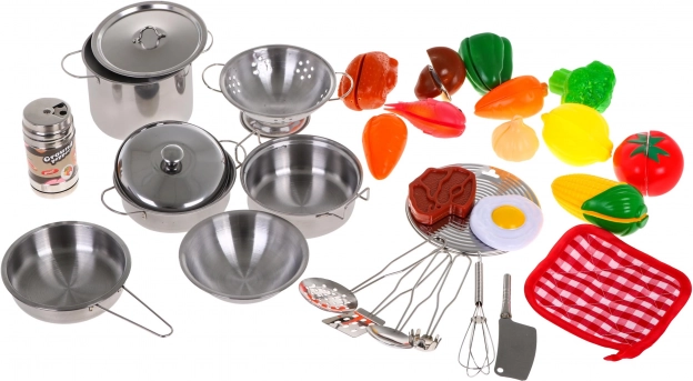 Otkrijte dječji kuhinjski set koji uključuje razna nehrđajuća posuđa i plastične imitacije namirnica. Idealan je za simulaciju stvarnog kuhanja i pomaže djeci u razvoju kreativnosti i igre uloga. Ovaj set je izvrstan dodatak omiljenim igrama na trgovinu, kuhinju ili kućanstvo.