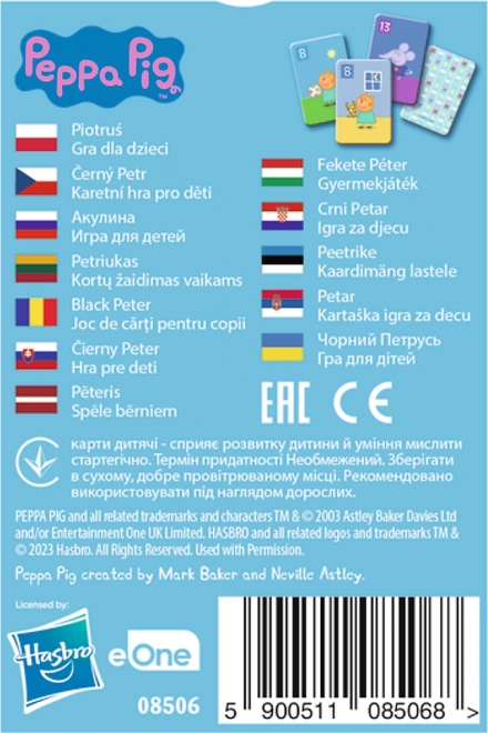 Zabavna kartaška igra Crni Petar s motivom PEPPA PIG za djecu od 4 godine. Potiče koncentraciju, zapažanje i društvene vještine. U pakiranju je 25 karata s omiljenim likovima, a jednostavna pravila jamče brzu i napetu igru za do 5 igrača.