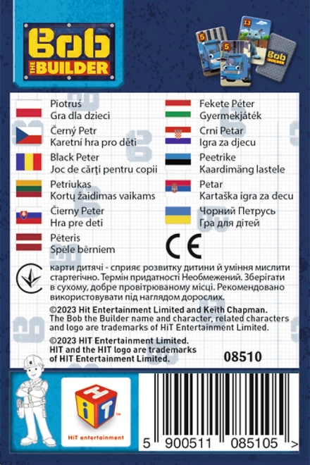 Tradicionalna igra Crni Petar vraća se u omiljenom dječjem motivu BOB GRADITELJ. Igrači dijele karte, stvaraju iste parove i nastoje se riješiti svih karata. Gubi onaj kome u ruci ostane Crni Petar. Jednostavna pravila jamče brzu i napetu zabavu za cijelu obitelj.