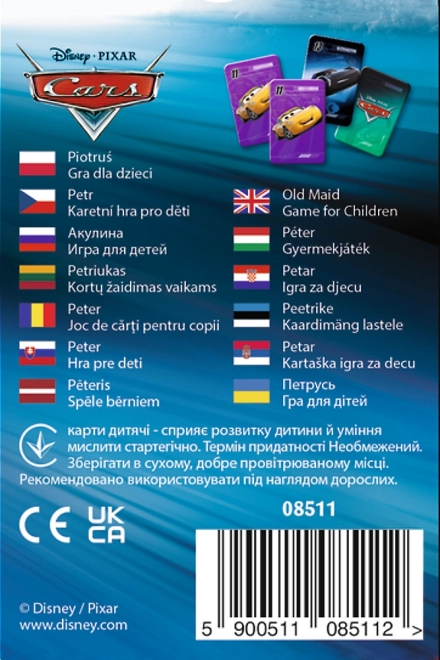 Tradicionalna igra Crni Petar zabavlja djecu već generacijama. U ovom izdanju s motivom Automobili igrači podijele sve karte, stvaraju podudarne parove i postupno ih odlažu. Napetost raste sa svakim potezom – onaj kome na kraju u ruci ostane karta Crni Petar, gubi.