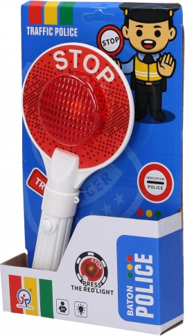 Realistična policijska stop palica za dječju igru i uvježbavanje sigurnog ponašanja. Jedna strana svijetli crveno, druga zeleno, tu su i svjetlosni efekti te baterije 3× AG13 u pakiranju. Kompaktna duljina 23 cm za jednostavno držanje.