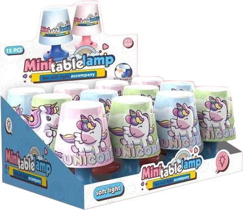 Mini noćna lampica u obliku jednoroga. Dimenzije 7,2 × 10,9 cm, 3× AG13 baterije u pakiranju, tri boje: plava, ružičasta, zelena.
