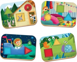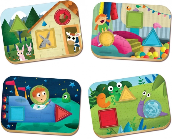 Ova igra potiče dječju pažnju, razvija njihovu maštu i uči ih prepoznavati osnovne geometrijske oblike i boje u različitim okruženjima: na farmi, u igraonici, na livadi i u svemiru.