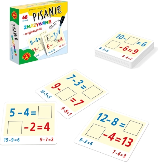 Set za pisanje oduzimanja - oduzimanje namijenjen je djeci koja počinju učiti matematiku. Na karticama seta nalazi se 68 zadataka iz oduzimanja. Nepoznati broj može biti jedan od 3 broja u zadatku. Operacije se izvode s brojevima od 1 do 20. Nepoznatice u zadacima ispisuju se flomasterom koji se može brisati, što omogućuje višekratnu upotrebu kartica. Igračka je izvrstan poticaj za pamćenje računskih zadataka i samostalno pronalaženje rješenja, čime se razvijaju prirodne sposobnosti. Svaki upisani rezultat može se provjeriti u rješenju navedenom na stražnjoj strani kartice. Praktična veličina pakiranja omogućuje da igračku ponesete doslovno bilo kamo sa sobom.