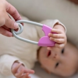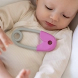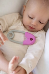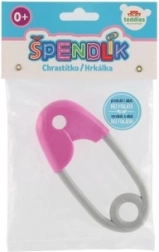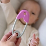 Zvečka u obliku sigurnosne igle neizostavan je dio opreme svake bebe. Dizajnirana je tako da bude lako prihvatljiva za male ručice i svojom lakoćom ne opterećuje dječje ruke. Njezine ružičasto-sive kontrastne boje privlače i potiču vizualnu percepciju. Djeca će zavoljeti nježno zveckanje koje prati svaki pokret.