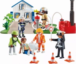 Playmobil Moje figure idealan su dodatak svakom modelu policijske postaje, vatrogasne stanice ili drugog gradskog scenarija. Uz pomoć ovih figurica moguće je odigrati razne priče – od izmišljenih požara do pljački banaka. Ovaj set donosi na scenu policajce, vatrogasca i spasioca koji u svakoj opasnoj situaciji spašavaju grad.