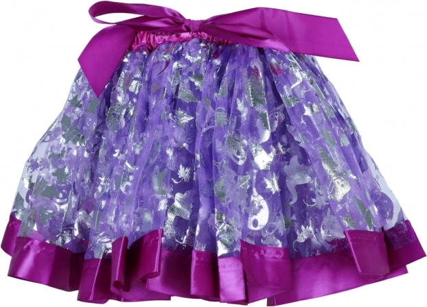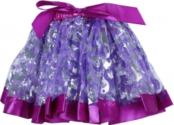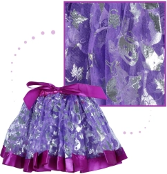 Ljubičasta suknjica sa sjajnim srebrnim uzorcima i elastičnim pojasom lako se prilagođava različitim tjelesnim oblicima.